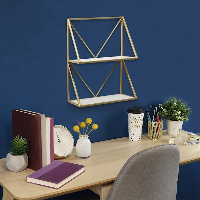 Round out your decor’s visual appeal with this charming 12x16in. two tier metal and wood wall shelf. This wall decor’s architectural details add a pop of pattern to your look, while the glam golden metal and natural wood blends effortlessly into any color palette. Hang this simple yet modern piece and it’ll round out your space with wonderful coordinating decor.