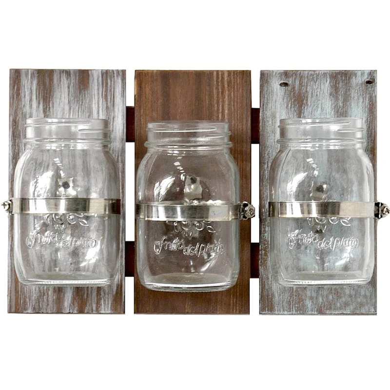 Add a pinch of fun to your den, patio or garden with our 12x8in. wood/glass three mason jars on panel wall decor. Created with love, this decorative wall plaque features a rustic, wood plank and mason jar motif to hold any greenery, florals and more. Everyone will enjoy the wonderful display. Made of tritone weathered wood, glass and metal, this wall art is designed to greet guests all season long.