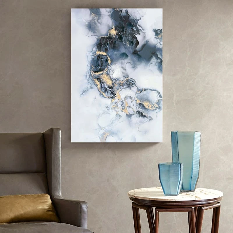 They say beauty is in the eye of the beholder. Art is too. Add a little character to any room in your home with our 24x36in. Break in the Clouds embellished canvas wall art. The possibilities are endless with this blue, grey, white and gold wall decor. A multicolor abstract cloud-look motif creates visual interest against a visually interesting backdrop. Hang this wall decor to make a bold statement and to add a touch of personality to your home decor.