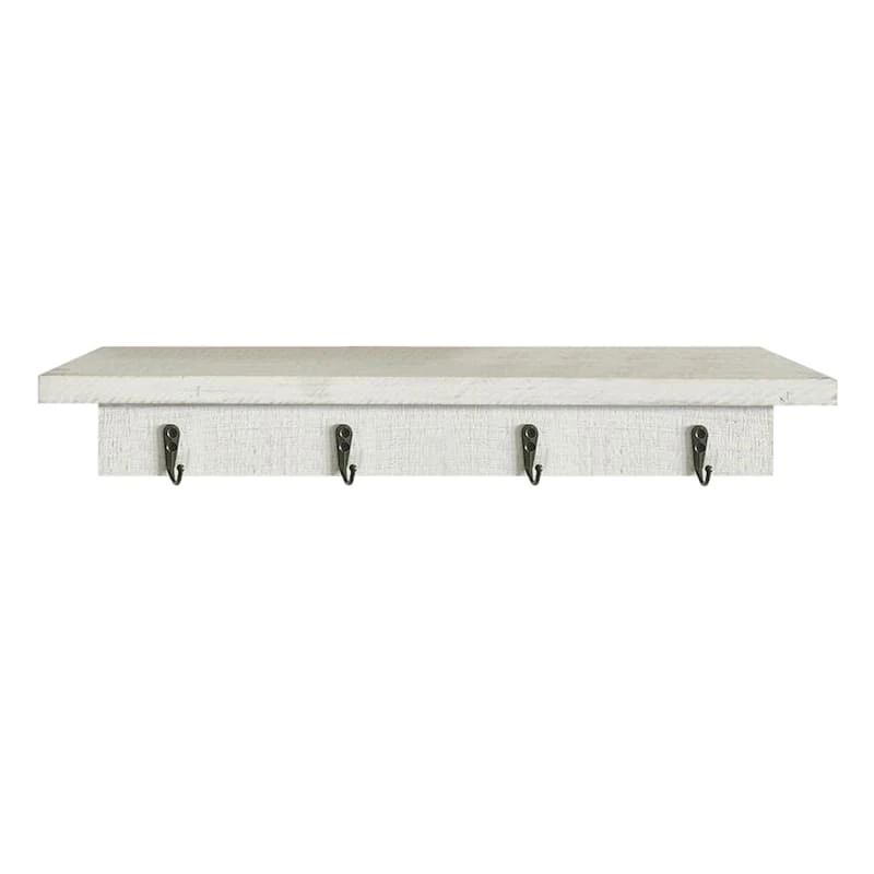 Round out your decor’s visual appeal with this charming 20in. wood shelf with four hooks. This wall decor’s architectural details add a pop of pattern to your look, while the white finish blends effortlessly into any color palette. Hang this piece and it’ll round out your space with wonderful coordinating decor.