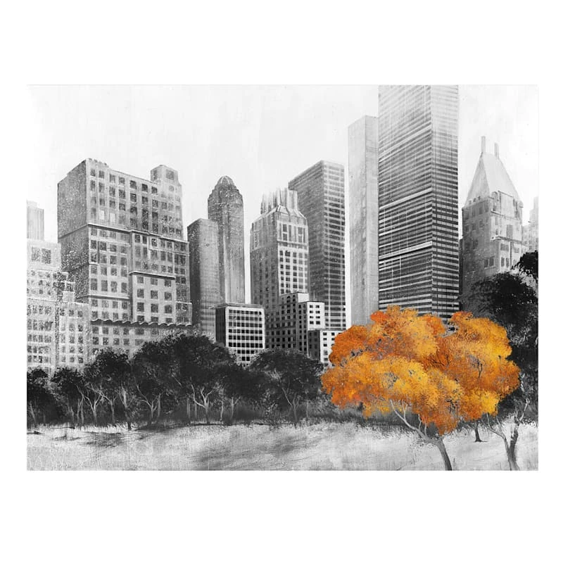 Celebrate autumn in the city with this dramatic city canvas wall art. This extra large black and white canvas print features an urban skyline playing backdrop to a boldly accentuated tree with brilliant golden foliage. The artist-quality canvas is printed and stretched over wooden framing in gallery wrap style. Boldly express your love of fall with this skyline canvas art print. Now all you’re missing is a pumpkin spice latte!