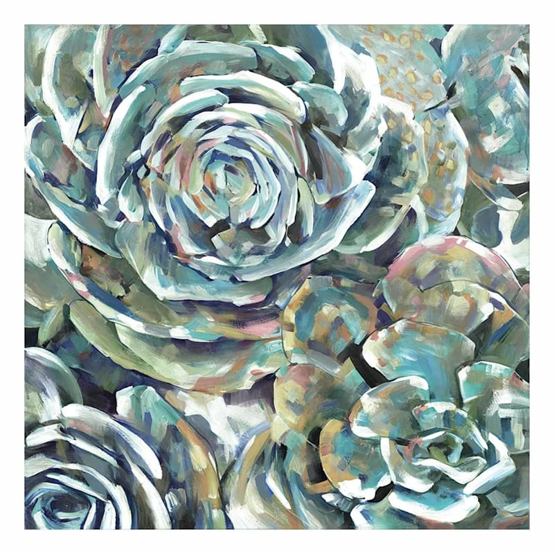 They say beauty is in the eye of the beholder. Art is too. Add a little character to any room in your home with our 35in. Desert Bloom Blues canvas wall art. The possibilities are endless with this green, blue, pink, gold and white wall decor. A wonderful oversized succulent motif creates visual interest against a visually interesting backdrop. Hang this wall decor to make a bold statement and to add a touch of personality to your home decor.