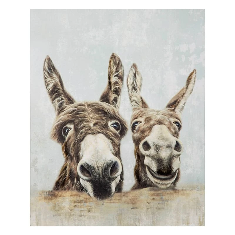 They say beauty is in the eye of the beholder. Art is too. Add a little character to any room in your home with our 16x20in. Farm Friends canvas wall art. The possibilities are endless with this white, black, grey, ivory, brown and white multi wall decor. A multicolor whimsical donkey duo portrait creates visual interest against a visually interesting backdrop. Hang this wall decor to make a bold statement and to add a touch of personality to your home decor.