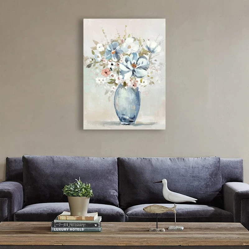 They say beauty is in the eye of the beholder. Art is too. Add a little character to any room in your home with our 24x36in. Floral canvas wall art. The possibilities are endless with this blue, pink, green, grey and ivory wall decor. A multicolor floral bouquet in vase motif creates visual interest against a visually interesting backdrop. Hang this wall decor to make a bold statement and to add a touch of personality to your home decor.