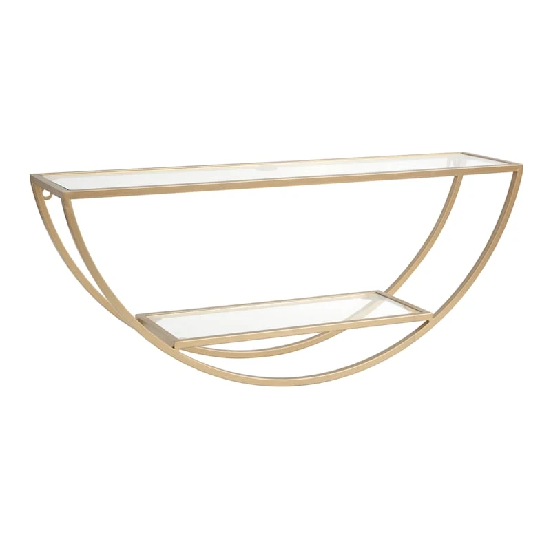 Round out your decor’s visual appeal with this charming 26x11in. golden arch metal and glass wall shelf. This wall decor’s architectural details add a pop of pattern to your look, while the golden glam blends effortlessly into any color palette. Hang this interesting modern piece and it’ll round out your space with wonderful coordinating decor.