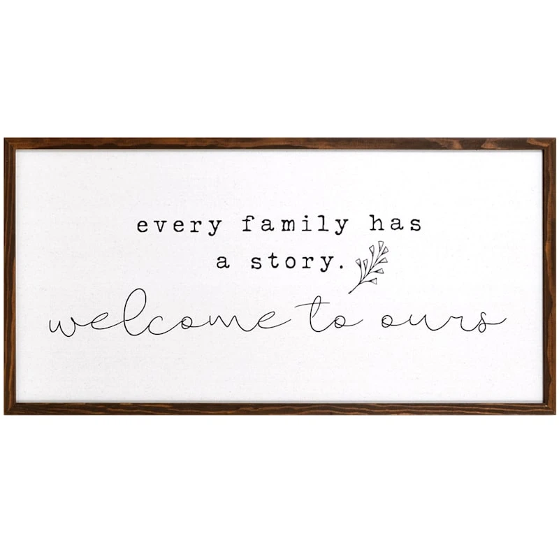 Modern farmhouse meets At Home prices in Honeybloom, our exclusive new brand that celebrates life lived together. This “Every family has a story. Welcome to ours” 16×32 in. wall sign is an easy way to add a pop of charm to any room during the holidays. Bring new life to your rooms with this interesting framed wall art. Featuring a natural, brown and white coloration, this plaque will bring years of enjoyment and add to your charming farmhouse setting.