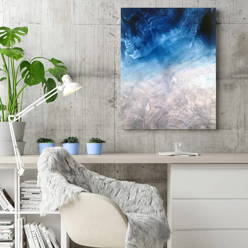 They say beauty is in the eye of the beholder. Art is too. Add a little character to any room in your home with our 22x28in. Indigo Tide glass coat canvas wall art. The possibilities are endless with this blue, grey and white wall decor. A multicolor overhead water landscape motif creates visual interest against a visually interesting backdrop. Hang this wall decor to make a bold statement and to add a touch of personality to your home decor.