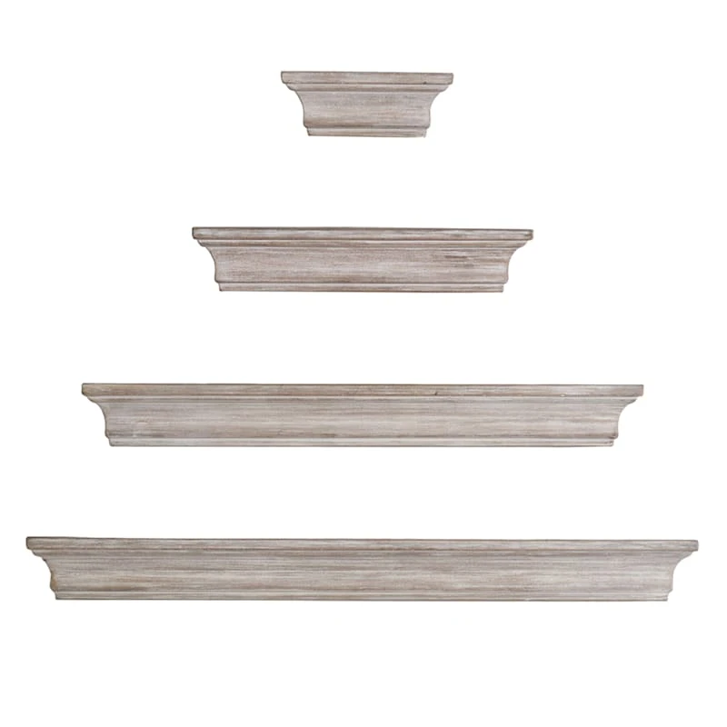Round out your decor’s visual appeal with this charming 4-piece Kate light grey wood crown ledge wall shelf. This wall decor’s architectural details add a pop of pattern to your look, while the intricate molded wood blends effortlessly into any color palette. Hang these simple grey shelves and it’ll finish out your space with wonderful coordinating decor.