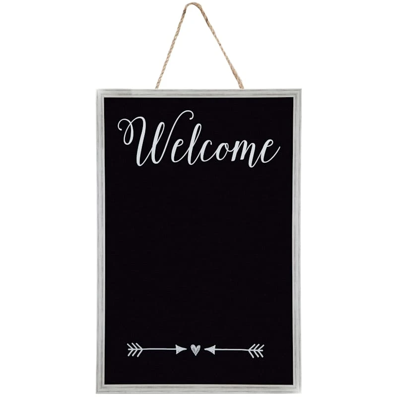 Our 23x35in. “Welcome” and arrow/heart accent hanging chalkboard will help you keep your days organized. This decorative wall-mounted board has a working chalkboard surface surrounded by a molded frame with an attached rope for hanging. Use this framed chalkboard in your laundry room, kitchen, home office or anywhere you see a need.