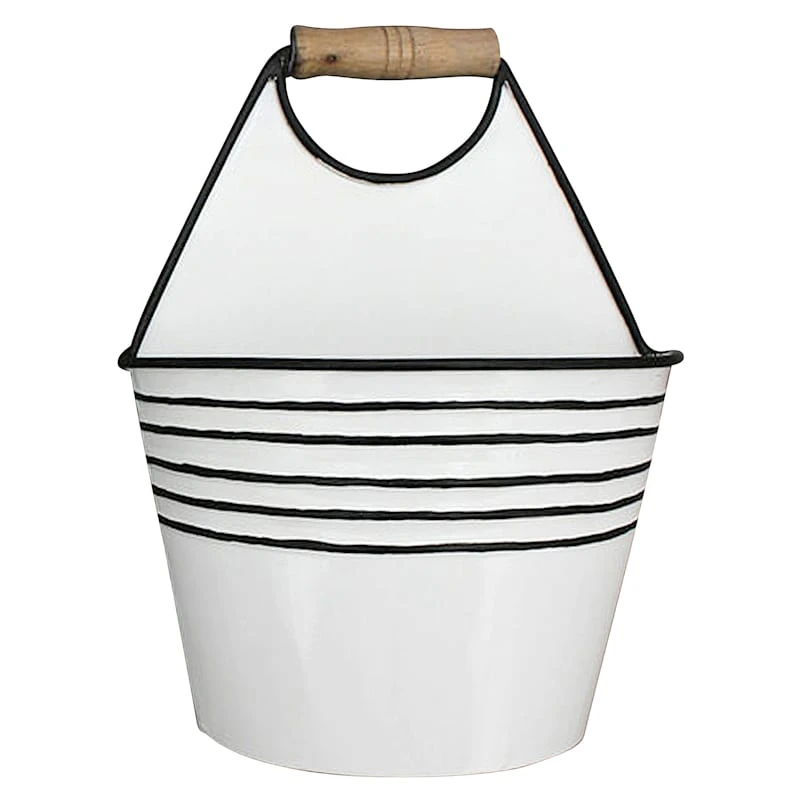 Add a pinch of charm to your interior walls or garden our 8x10in. black and white metal wall planter with wood handle. Created with love, this detailed farmhouse planter features allover enamel painted detailing. Everyone will enjoy wonderful retro bucket shape. Made of rust-resistant metal, this wall decor is designed to add to your decor in any room, the garden or around the patio.