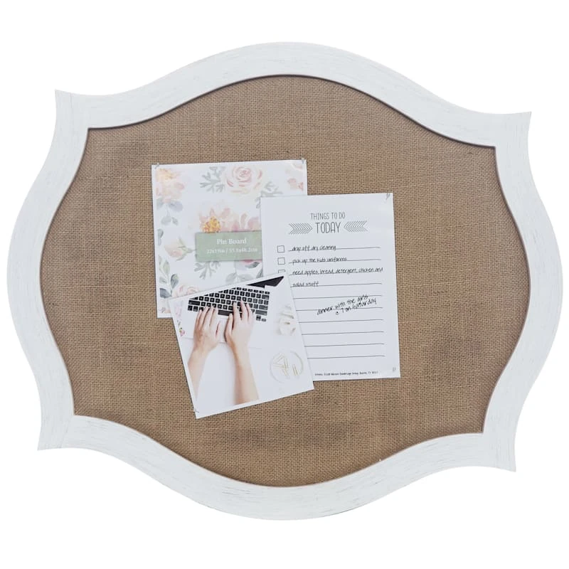 Our 22x19in. whitewash scallop with linen backer pin board will help you keep your days organized. This decorative wall-mounted board has a working linen pin surface surrounded by a molded medallion scallop frame. You also have the option to display horizontally or vertically to fit your needs. Use this framed pin board in your laundry room, kitchen, home office or anywhere you see a need.