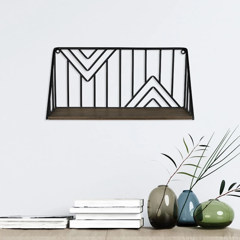 Round out your decor’s visual appeal with this 18x9in. wood and metal mountain peak wall shelf. This wall decor’s architectural details add a pop of pattern to your look, while the geometric mountain design and dark hue blends effortlessly into any color palette. Hang this interesting black metal and wood shelving and it’ll finish out your space with wonderful coordinating decor.