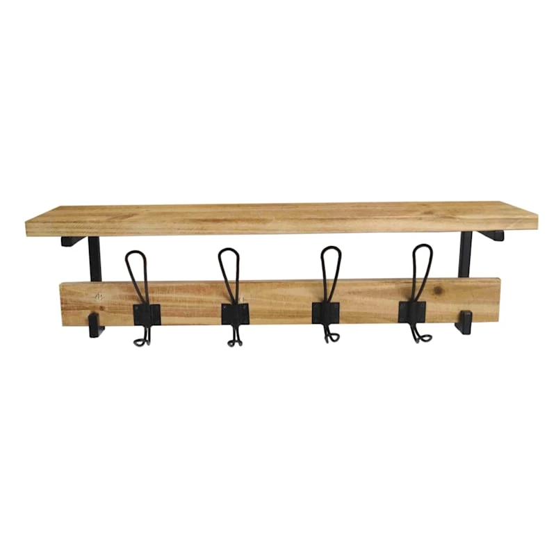 Round out your decor’s visual appeal with this charming 24in. mixed media wood shelf with four hooks. This wall decor’s architectural details add a pop of pattern to your look, while the black and natural finish blends effortlessly into any color palette. Hang this rustic farmhouse piece and it’ll round out your space with wonderful coordinating decor.